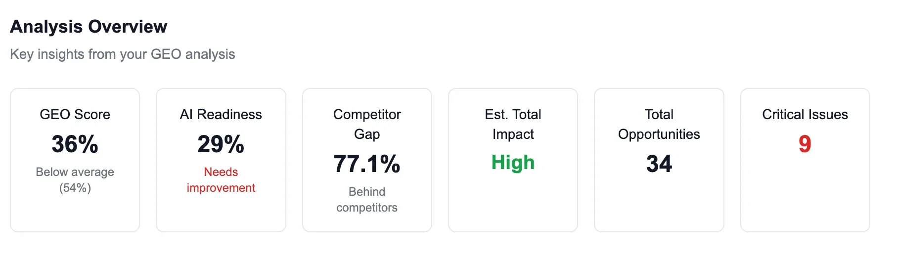 Think of this as your brand scorecard for SEO + GEO.